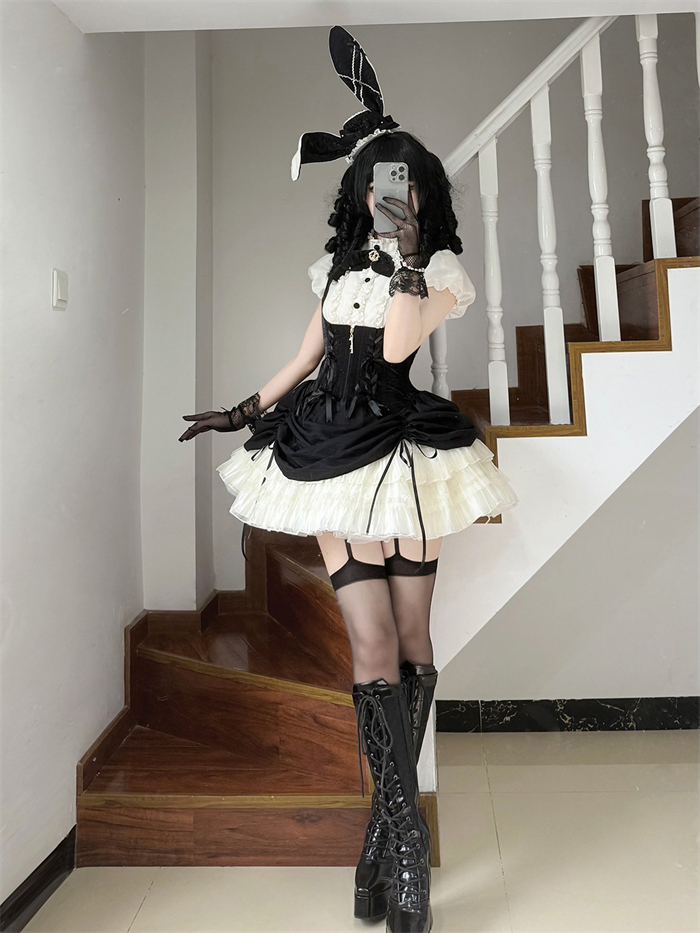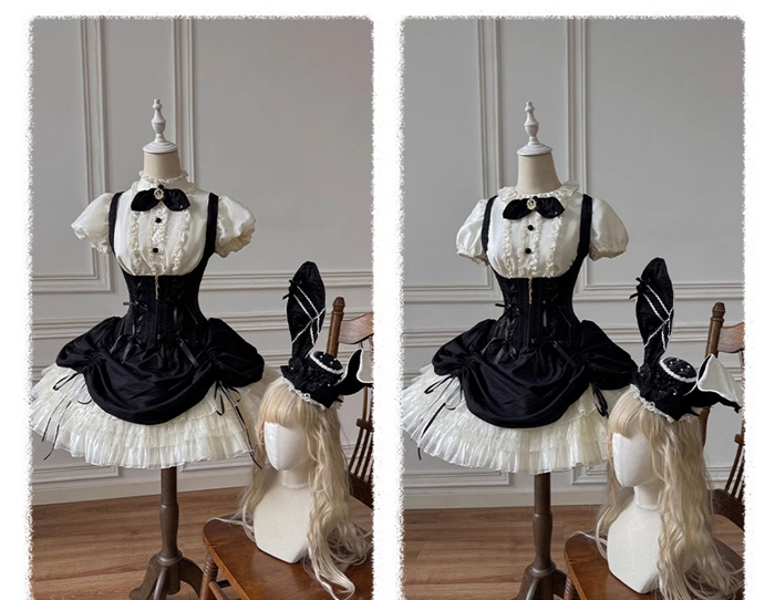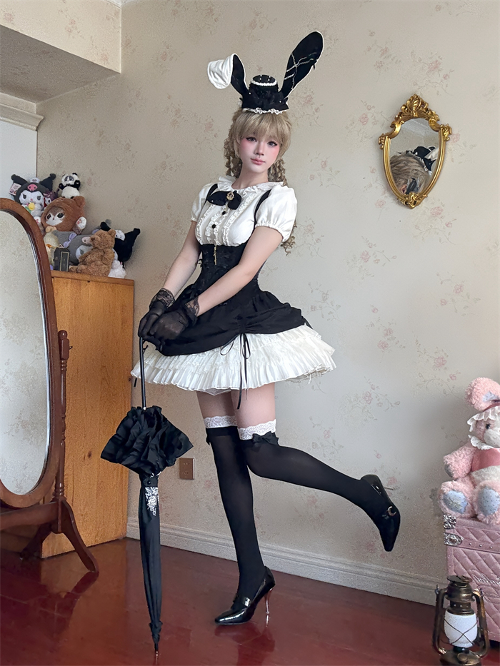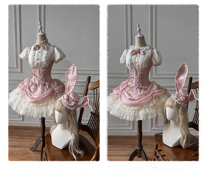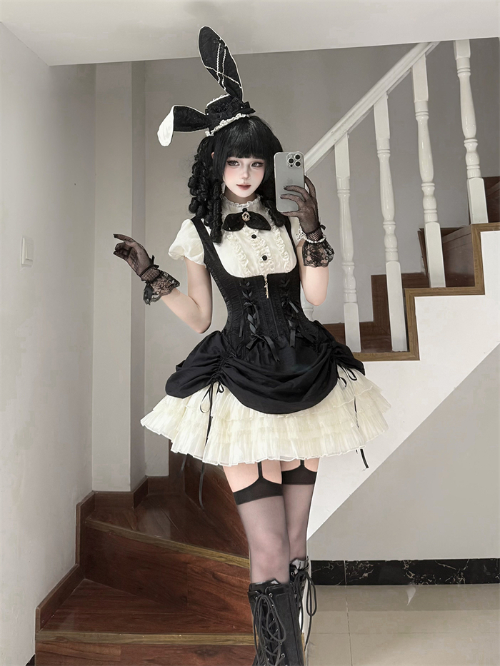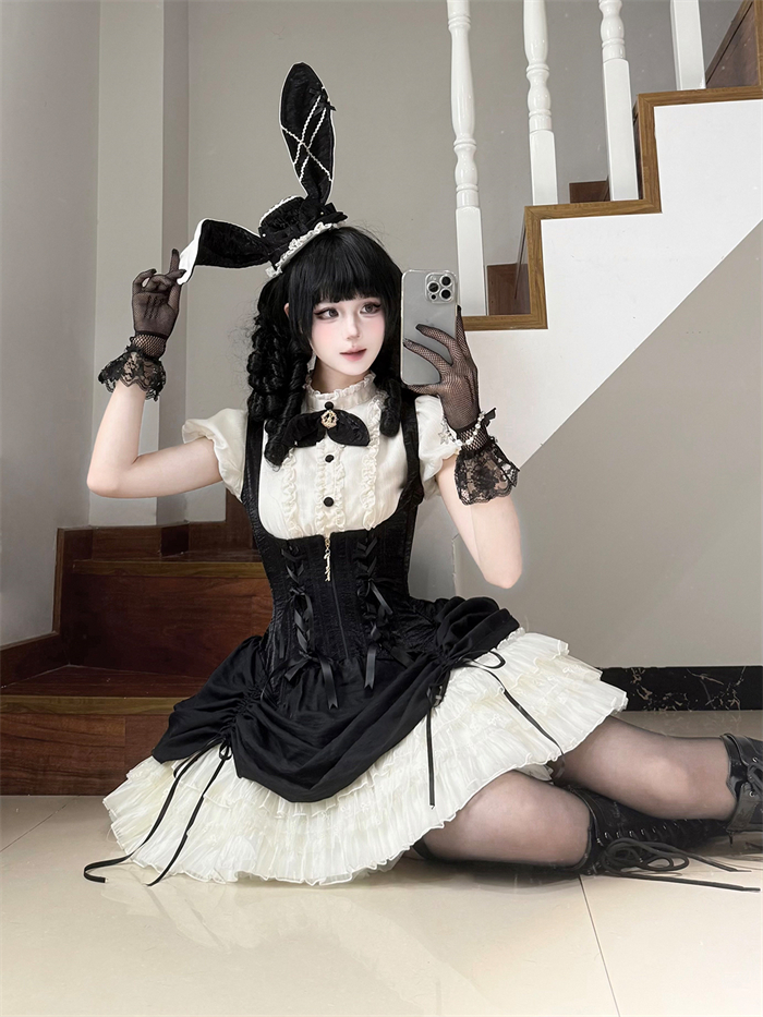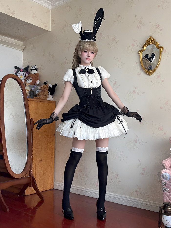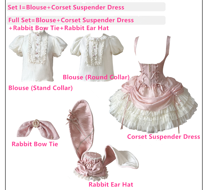 Full Set=Blouse(Stand collar/Round collar)+Corset Suspender Dress+Rabbit Bow Tie+Rabbit Ear Hat