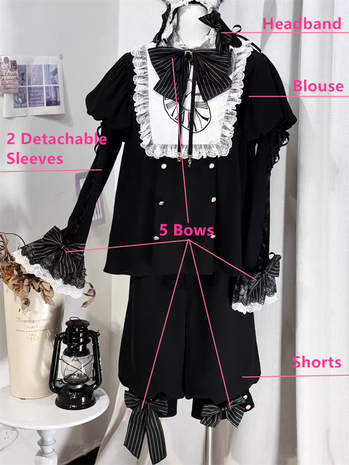 The Set = Blouse + Shorts + Headband + 2 Detachable Sleeves + 5 Bows