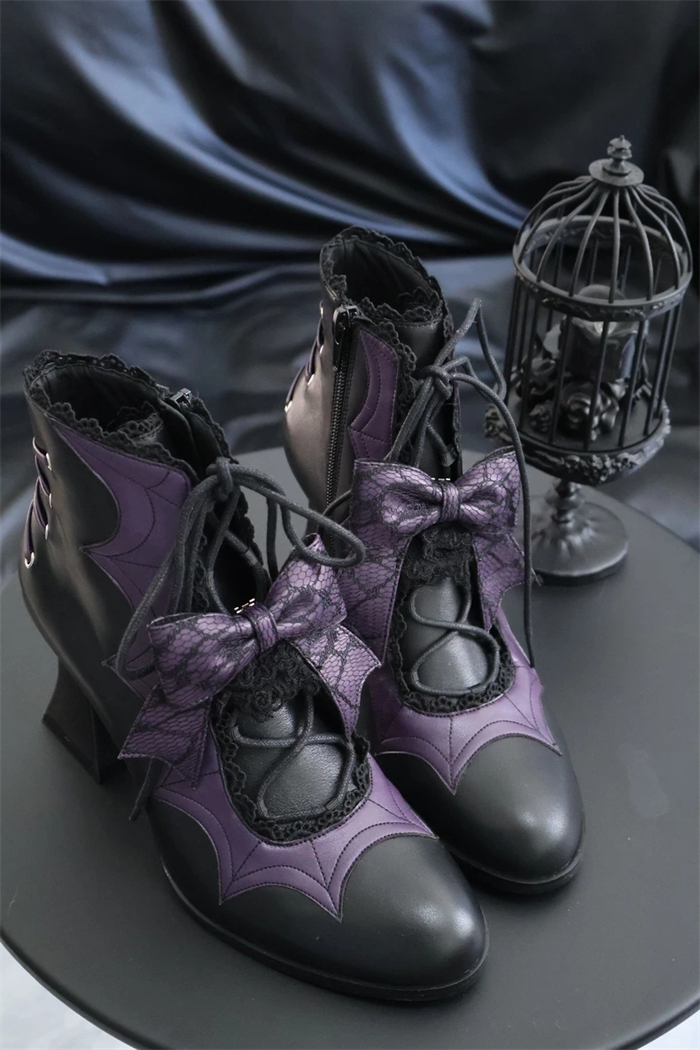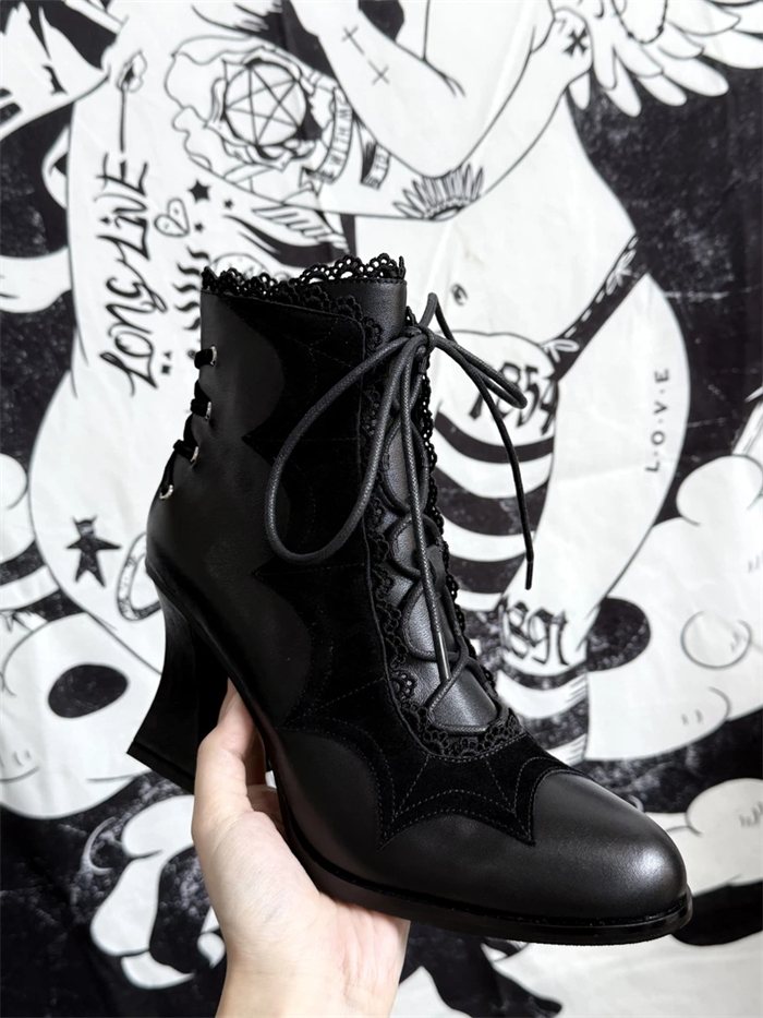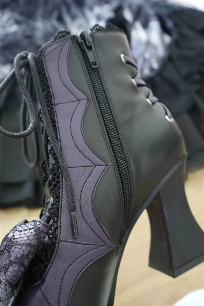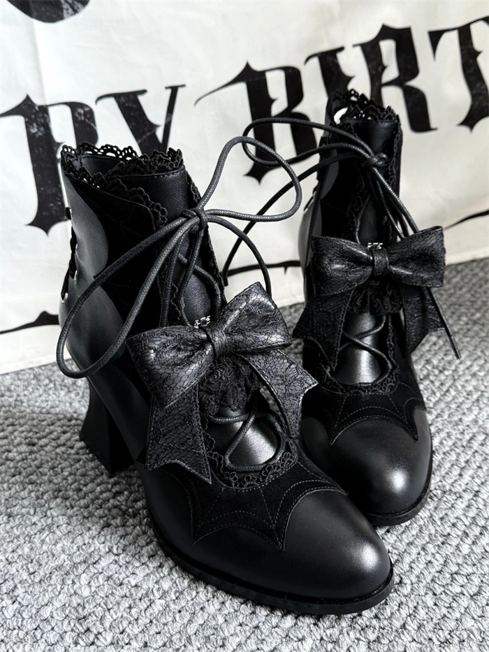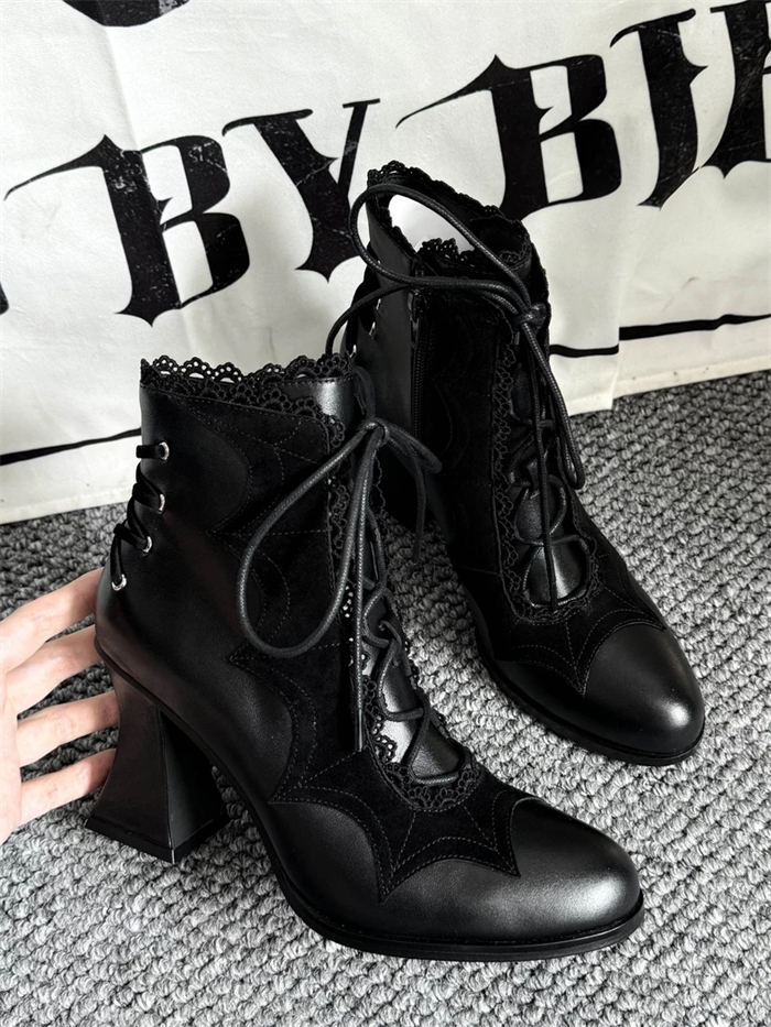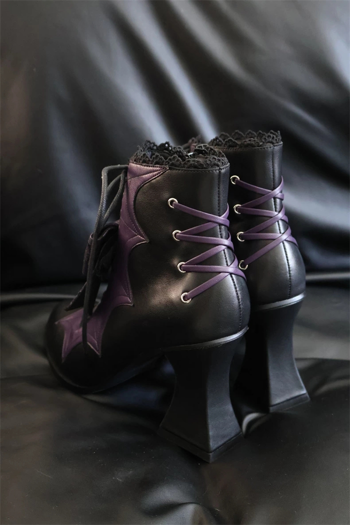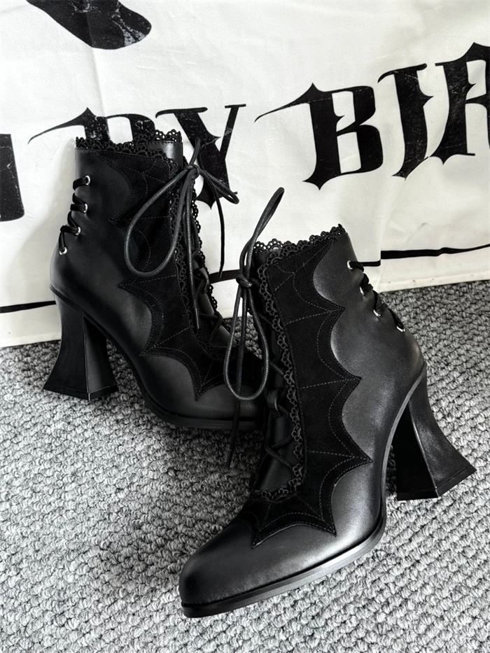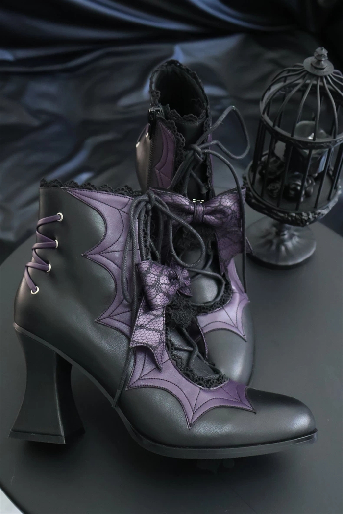 | Product Name | Gururu - Pointed Toes Bat Leather High Chunky Heels Halloween Gothic Lolita Ankle Boots |