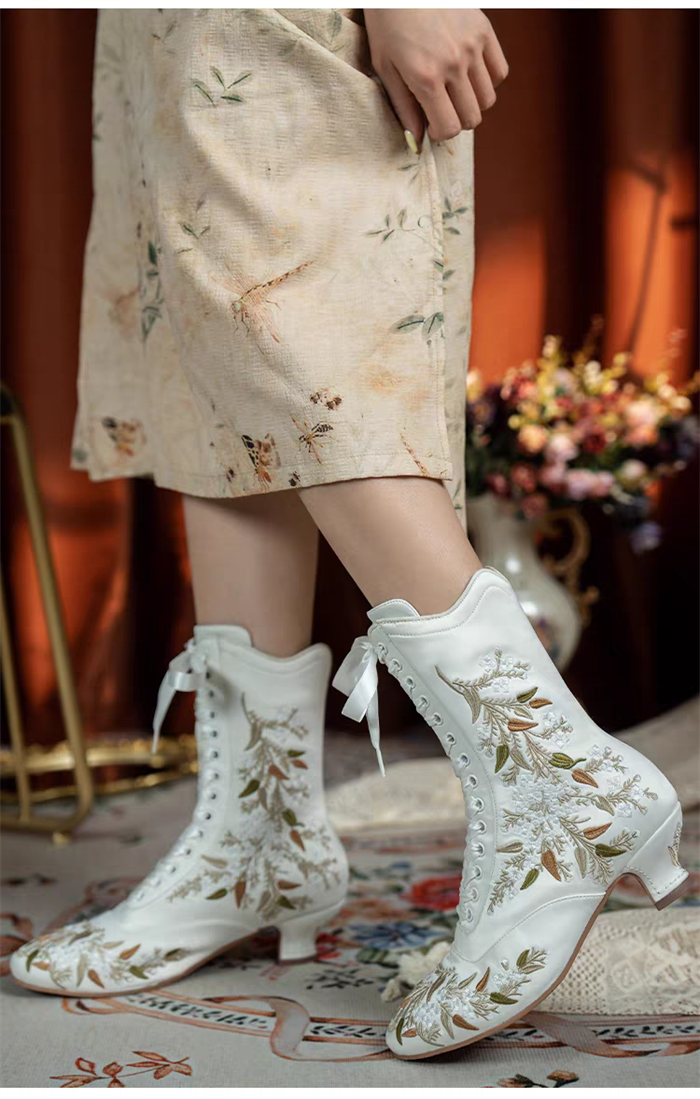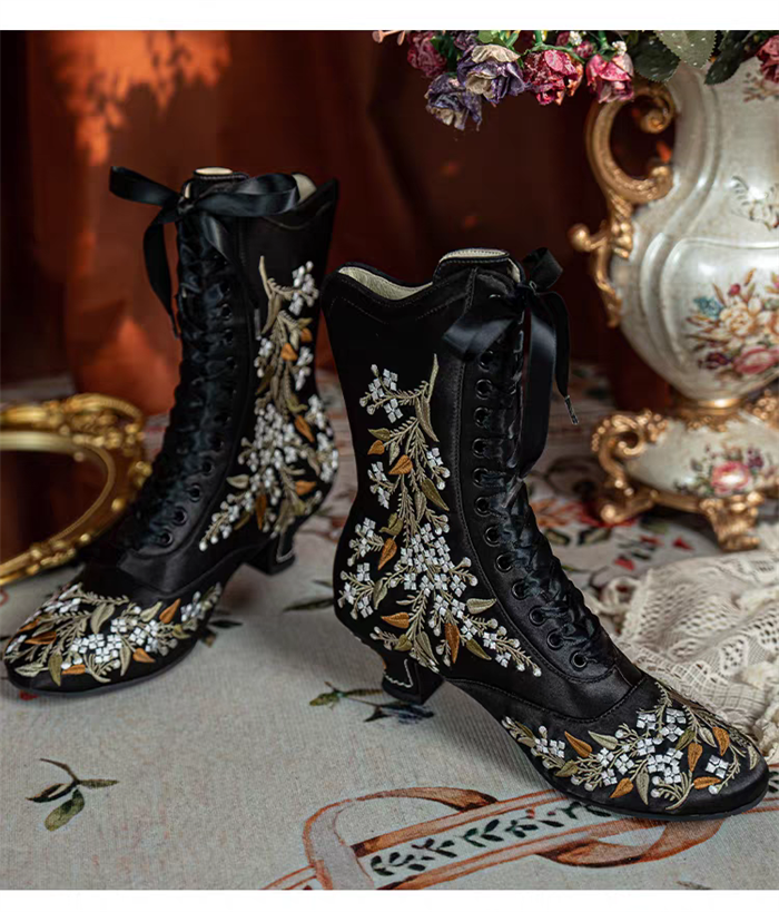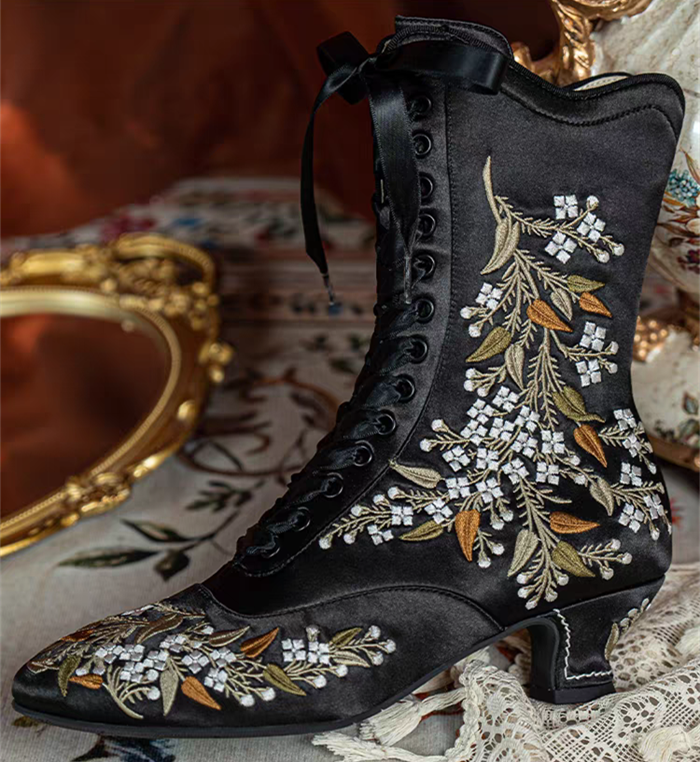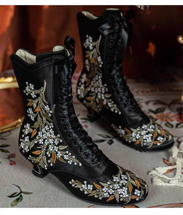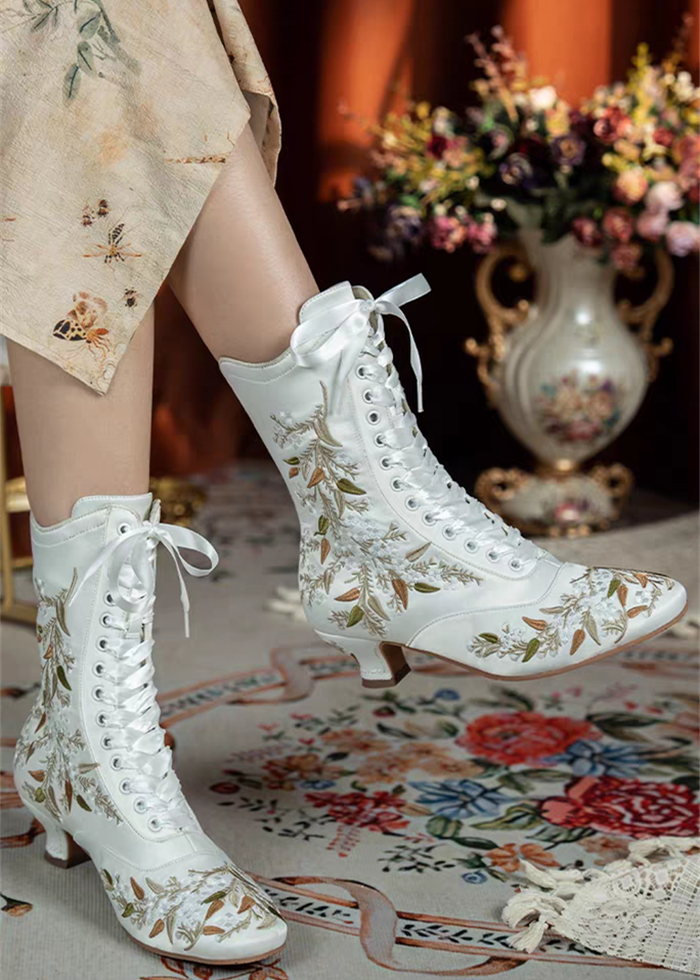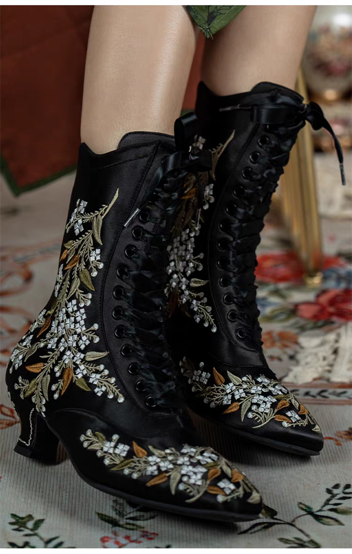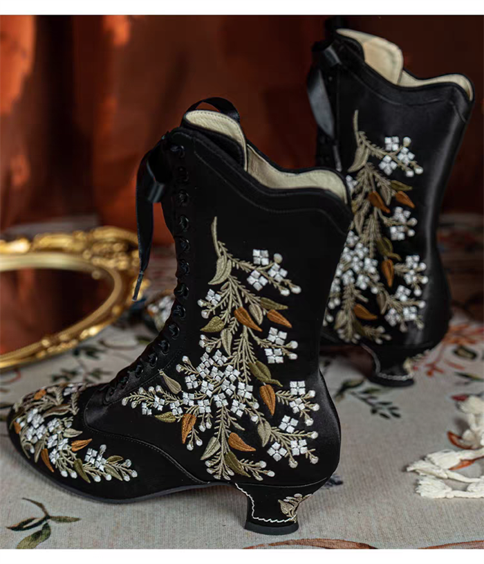 | Product Name | JUST ABOUT COMFORT - Retro Vintage Classic Embroidery Bow Pointed Toe Wine Glass Heels Chunky Leather Lolita Short Boots |