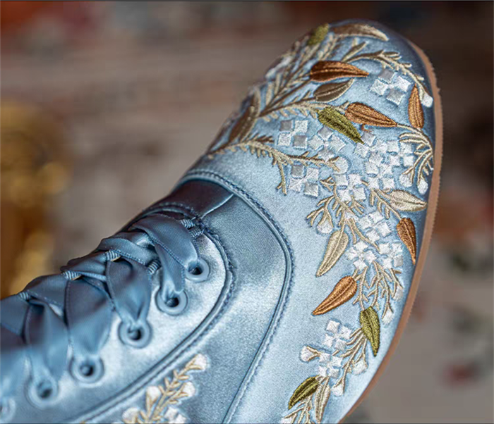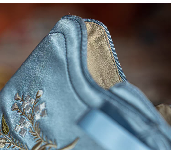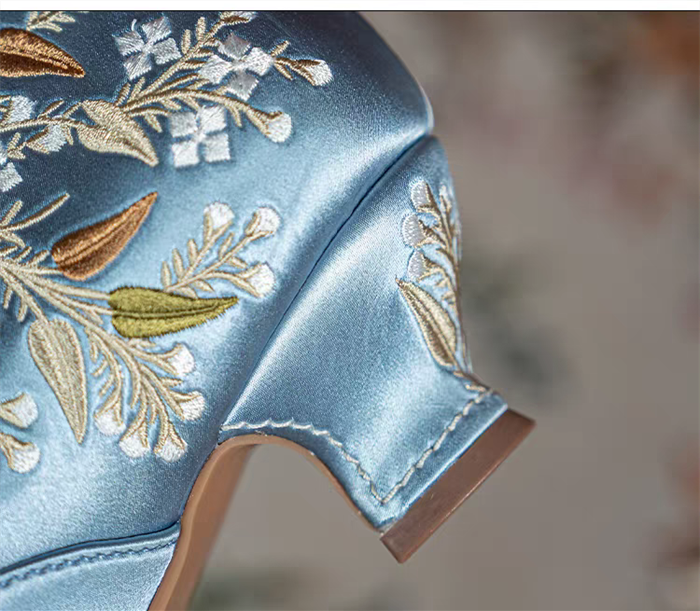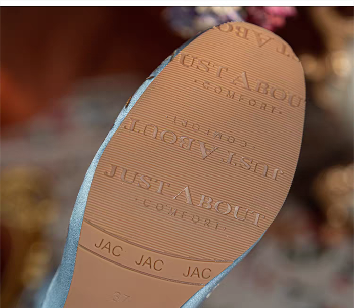 Materials: Insole: sheepskin; Upper: silk satin fabric; Lining: top-grain pigskin; Sole: rubber