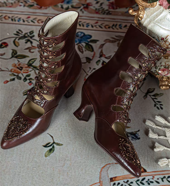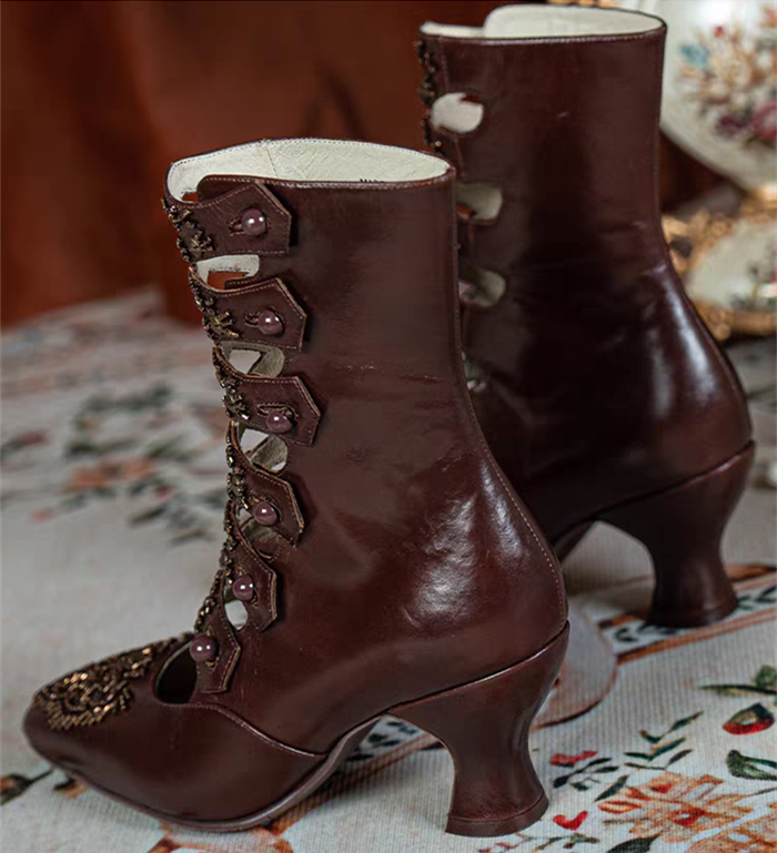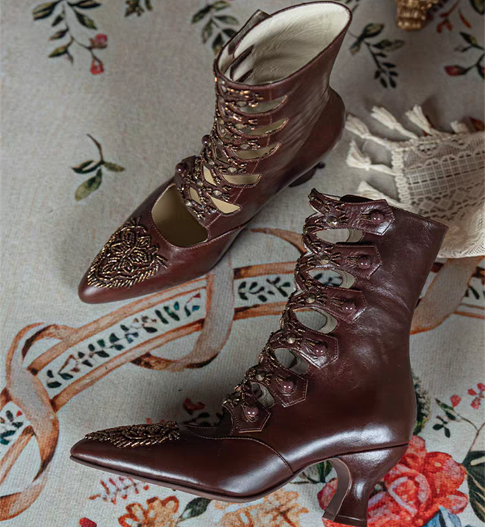 | Product Name | JUST ABOUT COMFORT - Retro Vintage Classic Pearl Embroidery Pointed Toe Wine Glass Heels Button Cut-out Lolita Short Boots |