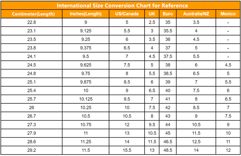 Note: Your foot measurements should be 2-3cm/0.8-1inch smaller than the size below to wear more comfortably. The measurements may have 1-3 centimeters difference.